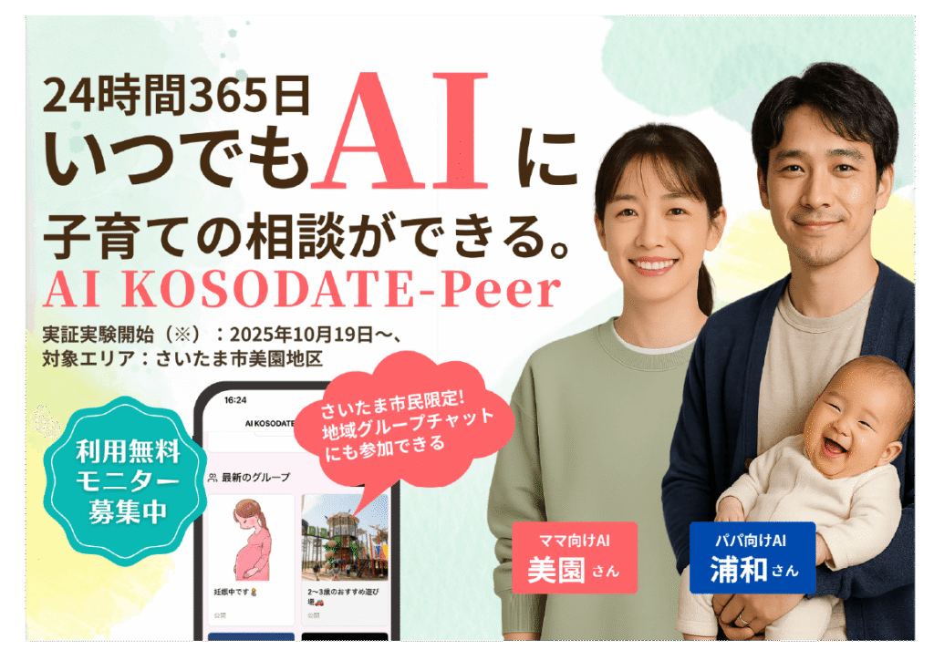 2025年7月17日、トモイク株式会社の「AI KOSODATE-Peer」が、さいたま市の「スマートシティさいたまモデル」構築事業費補助金の支援対象事業として採択されました。また当社は10月より、さいたま市浦和美園地区およびさいたま市内において、地域内での頼れる育児のつながりを創るべく、本サービスの実証的な運用を始めています。